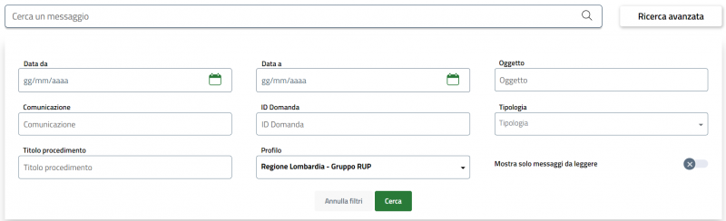 I form di ricerca presentano un pulsante di ricerca avanzata che al click aprono subito sotto i campi della form di ricerca. Qui sotto un immagine che mostra come sono fatti